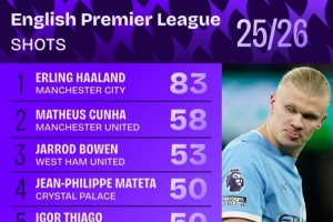 体育资讯1月10日讯 Squawka统计了本赛季球员在英超的射门次数,并列出榜单,哈兰德83次断层居首。