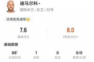 体育资讯1月12日讯 国米在本轮意甲对阵那不勒斯,迪马尔科本场数据如下: