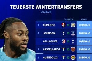 24直播网01月17日讯 2025-26赛季冬窗转会费排行出炉。塞梅尼奥以7200万欧从伯恩茅斯转会曼城,位列榜首。布伦南·约翰逊和加拉格尔均以4000万欧并列次席,前者从热刺转投水晶宫,后者则从马竞加盟热刺。