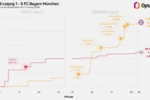 数据统计显示,拜仁上次在德甲联赛客场半场落后情况下在下半场打进5球,还是1976年9月:半场0-3波鸿,最终6-5获胜。