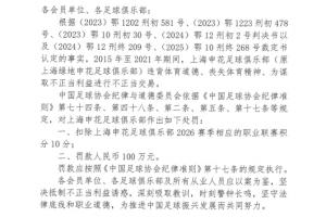 一、扣除上海申花足球俱乐部 2026 赛季相应的职业联赛积分 10分;