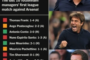TA也盘点了热刺近10位主帅在首次面对阿森纳的战绩,具体如下:
