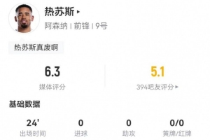 体育资讯1月4日讯 阿森纳在本轮英超3-2击败伯恩茅斯,热苏斯本场数据如下: